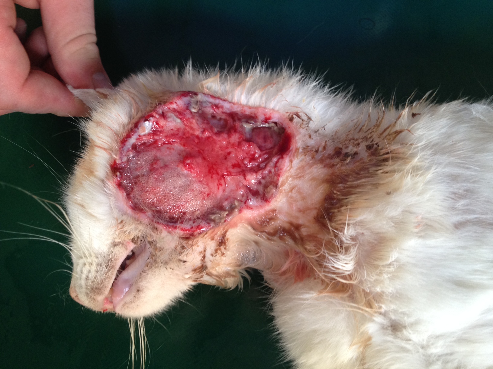 Jego biedne ciałko gniło w dosłownym tego słowa znaczeniu. Widać, że się męczył. Dziwne, że był jeszcze w stanie przychodzić na jedzenie. Dzięki temu udało się go złapać.
