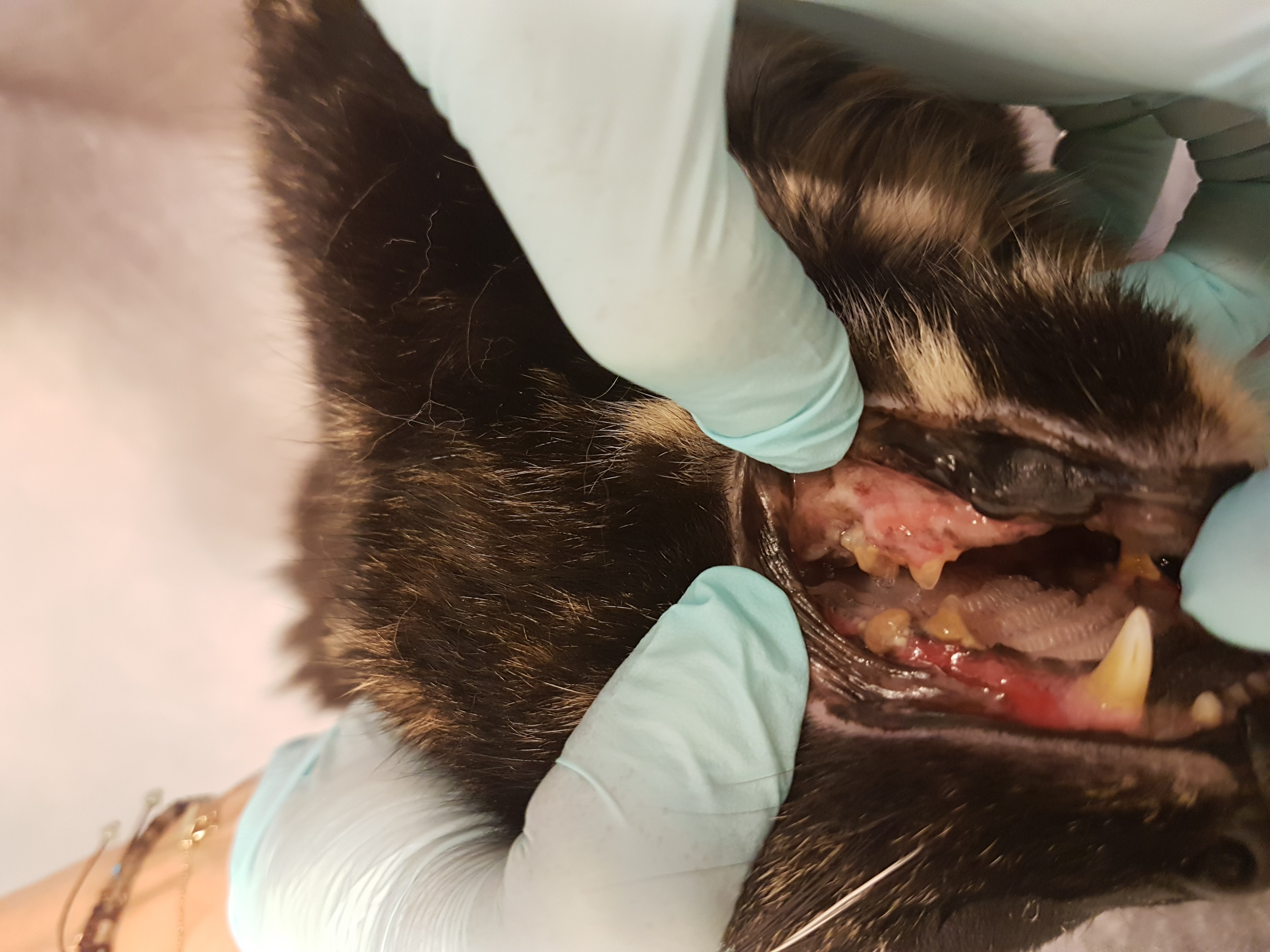 Kicia kocia został odwieziona do szpitalika. Pierwsze co udało się ustalić, to fatalny stan zębów. Zapalenie dziąseł, kamień, ból, niemożność jedzenie i oczywiście mycia się. Wszystkie zęby trzonowe do bezwzględnego usunięcia i to jak najszybciej. Kolejna, co lekarz stwierdził to kolejne guzy na drugiej listwie mlecznej – jednak RTG płuc wykazało, że płuca są czyste – UF! Niestety USG daje niepokojący obraz zapalenia jelit i żołądka. Zresztą Kicia kocia ma fatalną biegunkę… Trzeba zrobić biopsję i sprawdzić jaka jest przyczyna.