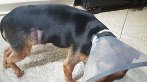 Tobiaszek ma 15 miesięcy, to młody i żywiołowy psiak... No i niestety ta żywiołowość doprowadziła do tragedii. Kilka dni temu- 14 października, Tobiaszek wpadł pod samochód. w wyniku którego doszło do około 8 cm długości rozcięcia podbrzusza oraz poważnego urazu tylnej łapki. Psiak dostał zastrzyki przeciwbólowe, o ile ranę udało się zaszyć i nie stanowi zagrożenia, o tyle łapka jest w dużo gorszym stanie.