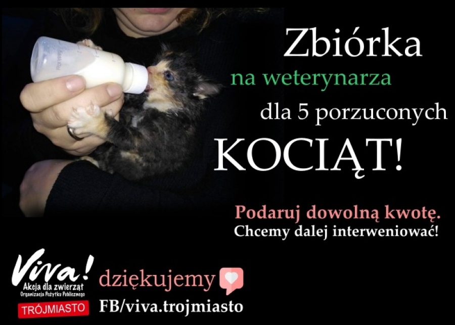 Kotki mają już 1-sze odrobaczanie za sobą, korzystają z kuwety oraz jedzą już stały pokarm. Choroba i fakt, że Wolontariuszka w ciągu dnia pracuje, wymusiło umieszczenie kociąt pod całodobową kuratelą weterynarza w szpitaliku, co wygenerowało koszta, których nasza Wolontariuszka nie jest w stanie udźwignąć samodzielnie - dlatego prosimy o drobną wpłatę - grosz do grosza może zdziałać cuda!