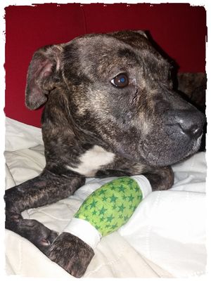 Przednia łapka była złamana- złamanie otwarte z odłamkami... Suczka dzielnie znosiła usuwanie kawałków kości, bo czuła się bezpieczna w ramionach nowej opiekunki. Ale najgorsze wieści nadeszły gdy weterynarz zajrzał do pyszczka suni- złamana szczęka, rozwarstwione podniebienie oraz otwarta przetoka, przez którą pokarm dostawał się do oczu i nosa, a dodatkowo utrudniała oddychanie. Do tego połamane kły z nerwami i miazgą na wierzchu... Jak potworny ból musiało czuć to biedne umęczone ciałko? Nawet nie próbujemy sobie wyobrazić. Mimo to suczka nawet nie jęknęła przy jakimkolwiek zabiegu. Najpierw usunięte zostały odłamki kości z przedniej łapy i zaleczony stan zapalny.