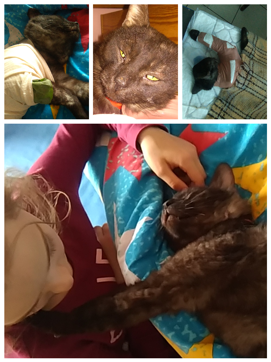 Później lekarz odmówił operacji, gdyż nie mieliśmy jeszcze zebranych pieniędzy i pomimo naszej deklaracji, że wszystko opłacimy... nawet nie spojrzał na cierpiącego kota! I tutaj z pomocą przyszła nam nieoceniona NATOLIŃSKA LECZNICA WETERYNARYJNA!!! Cudowni, fantastyczni lekarze, którzy z dnia na dzień przyjęli Blackiego na stół operacyjny! Łapce groziła amputacja, ale podjęto próbę jej uratowania, gdyż Blacky jest młody, żywiołowy i zwyczajnie potrzebuje wszystkich czterech łapek!